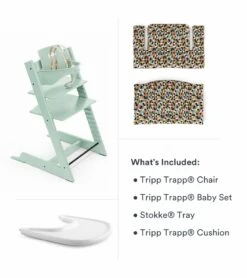 Tripp Trapp High Chair And Cushion With Stokke Tray Bundle – Soft Mint / Honeycomb Happy / White