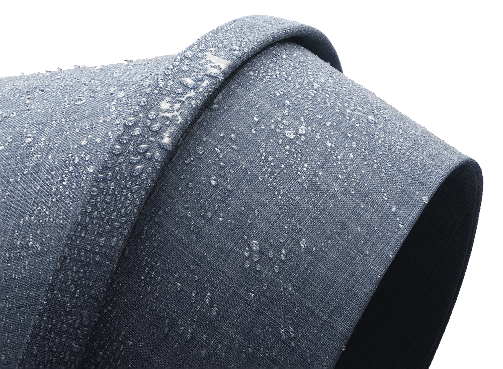 Soft blue fibers, woven together with lighter, neutral fibers give a rich melange look to the water repellent textiles used exclusively for this stroller. |