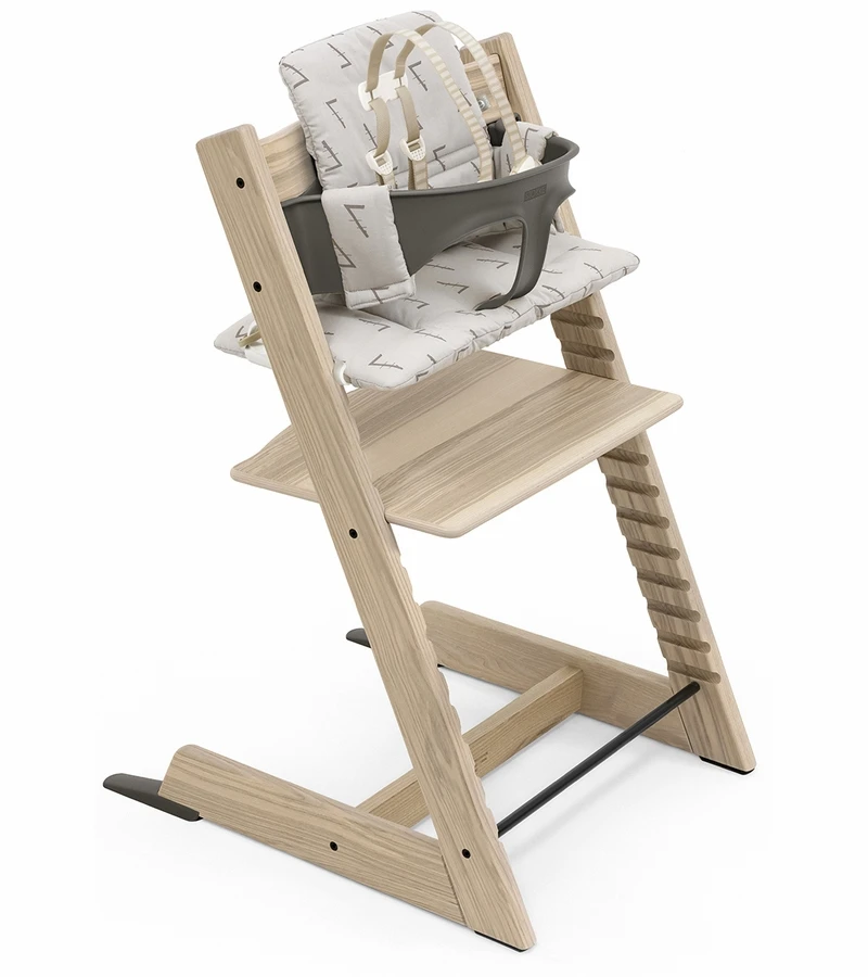 The Tripp Trapp® Chair is conveniently offered in a package that also provides a Tripp Trapp® Baby Set with harness and gliders, plus a Tripp Trapp® Classic Cushion and Tray. When used together, these items make a standalone high chair, which safely and ergonomically sits children from 6 months to 3 years. The adjustable design allows freedom of movement with both depth and height adjustable seat and footplates, ensuring ergonomic seating positions throughout its use. Remove/replace the accessories at a later life stage to continue to use the Tripp Trapp® Chair as your child grows beyond this High Chair stage (3 yrs. old). By removing and/or using without the tray, this High Chair fits right up to your dining table, bringing your baby into the heart of your family to learn and develop alongside you.